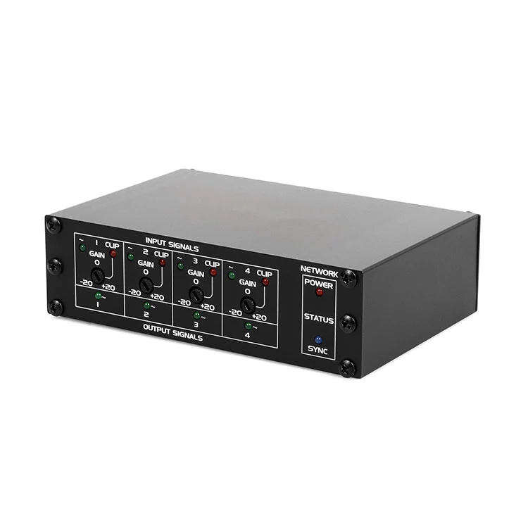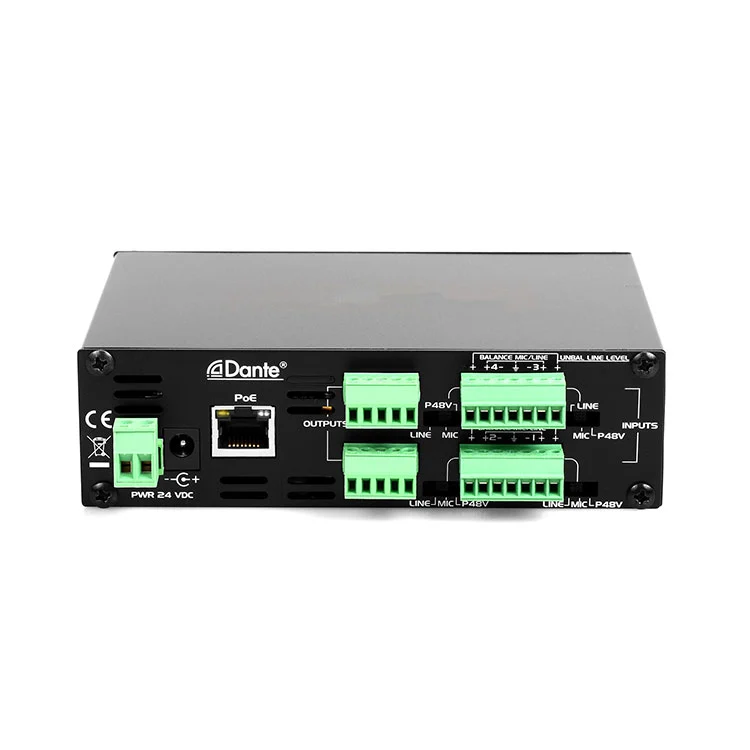 Ang 4 MIC at Line Inputs Dante Interface ay isang propesyonal na interface ng audio batay sa Dante Network Protocol, na sumusuporta sa 4 na mga input ng mikropono/linya at 4 na output. Ang pangunahing bentahe nito ay upang maipadala ang mataas na kalidad, mababang-latency na mga signal ng audio sa pamamagitan ng mga network ng IP, na angkop para sa mga senaryo na nangangailangan ng kakayahang umangkop na mga kable, remote na paghahatid o multi-channel audio integration.Ito ay angkop para sa live na tunog, roadcast/streaming production, conference system, ang mga lugar na pang-edukasyon ay angkop at iba pa.
