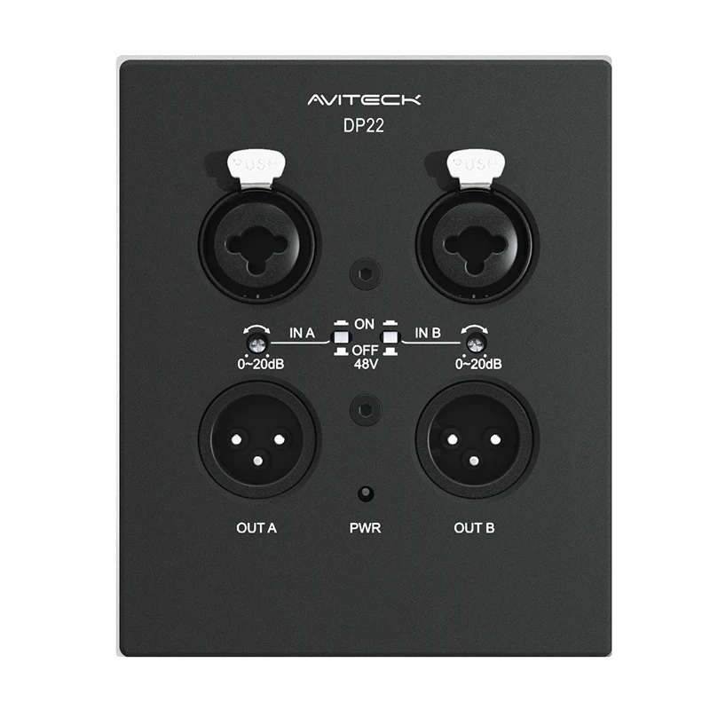Ang FHBAVTEC® Dante 2 CH Wall Plate Network Audio Interface (DP22) ay may built-in na Dante module para sa analog sa Dante Digital Signal Transfer at isang Dual Channel Input Phantom Power Switch. Ang isa pang mahusay na tampok ay maaari itong maging Poe powered.
